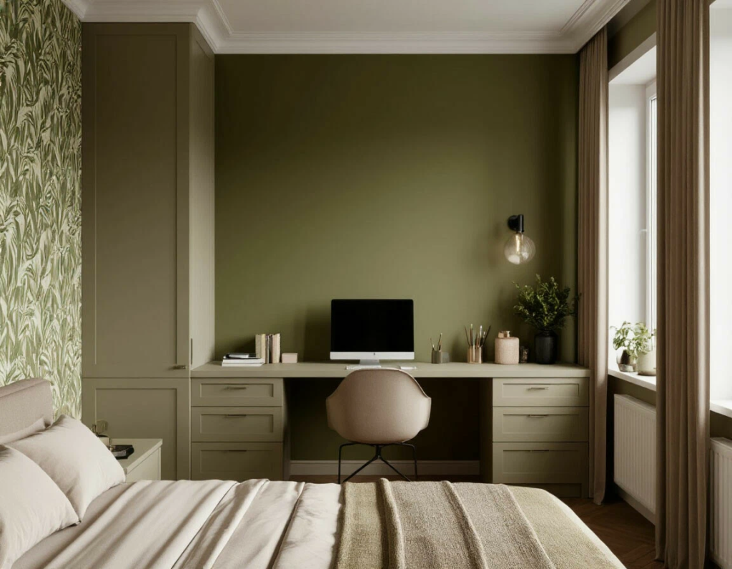 • Зонирование: спокойные однотонные оттенки в пространстве для сна, структурные или геометрические — на месте работы.